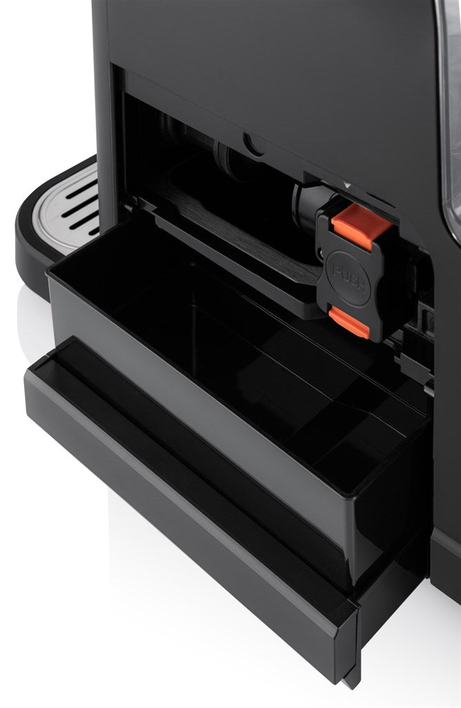 Носик для кави, звичайно, пристосується до розміру вашої чашки: щоб приготувати еспресо, потягніть носик вниз, а щоб приготувати латте макіато в склянці, потягніть носик вгору та, якщо необхідно, зніміть піддон для крапель. ETA Nero Crema підходить для всіх розмірів!